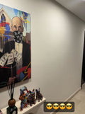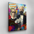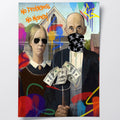 This artwork reimagines the classic American Gothic painting with a rebellious, modern twist. The couple, once symbols of tradition and simplicity, are now masked in luxury brands, holding a bouquet of dollar bills instead of farming tools. Spray-painted graffiti shouts “No Problems, No Money” across the canvas — flipping the old saying on its head.